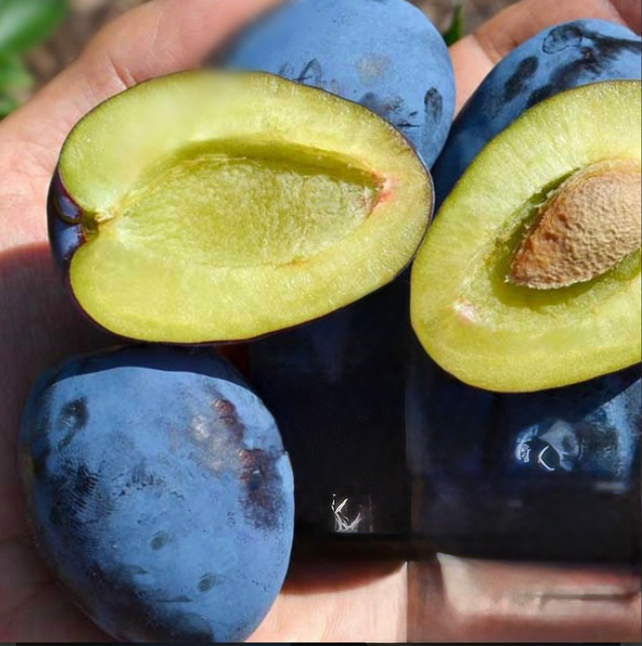 Prunele sunt medii - mari, greutate aproximativa de 35g, dulci, suculente, cu pielita acoperita de pruina groasa, pulpa nu este aderenta la sambure.
